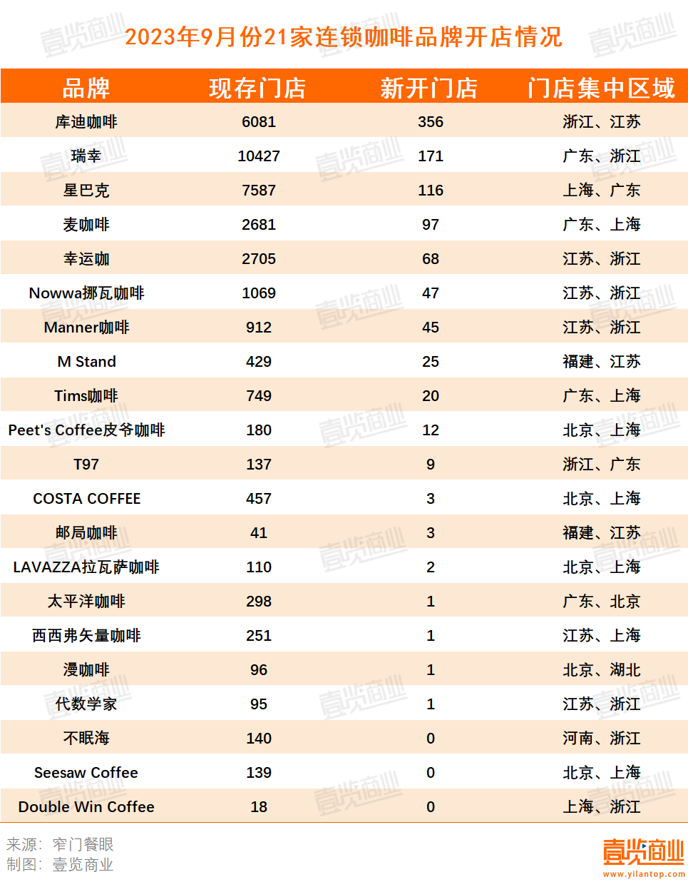 从整体开店数量看:2023年9月份,国内21家连锁咖啡品牌一共新开门店978家。现存门店一共38126家。