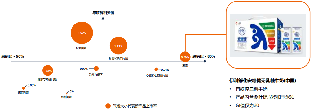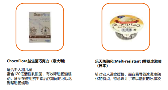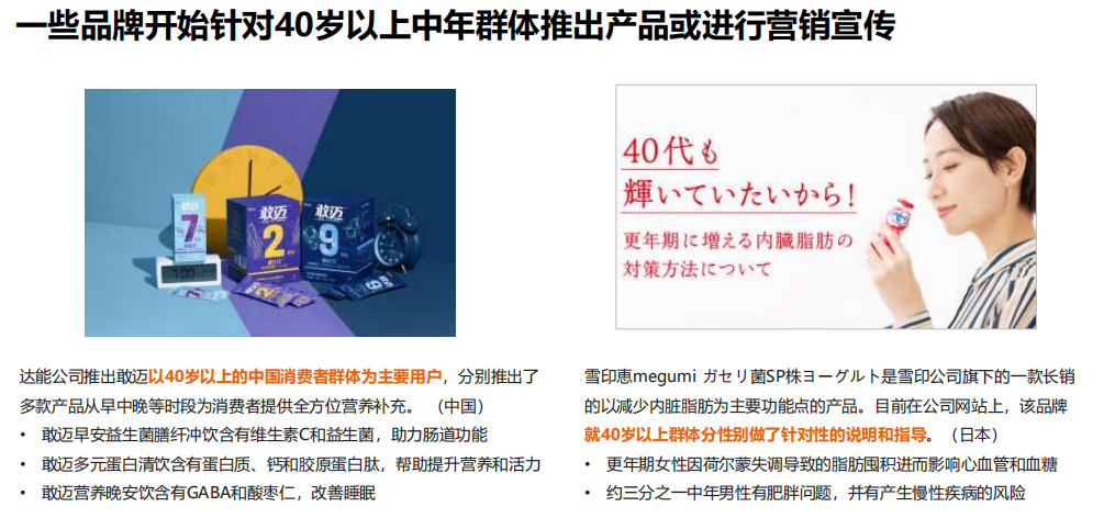 总体来说,中国的中老年食品跟全球市场相比的品类高度集中化的现象更为严重,主要集中在白奶(液奶和奶粉)。在过去三年内,中国的中老年食品饮料品类已经开始朝多元化的方向发展。如酸奶、热食谷物产品以及营养代餐饮品。在将来,品牌可以超更多的品类拓展,如全球市场的饼干、谷物棒等。