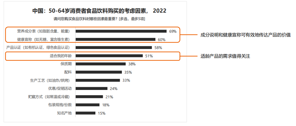 营养成分和健康宣称是老年消费者的普遍诉求,适龄宣称成为新的机会点。
