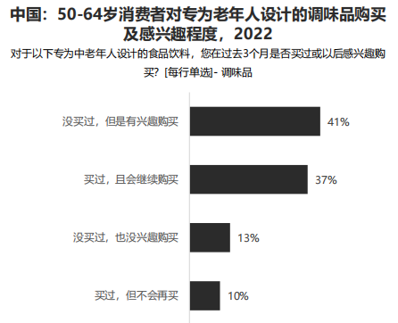与其他品类相比,老年消费者对于酱料和调味品的没兴趣购买的比例最低,而“没买过专为老年人设计的产品,但是有兴趣购买”的比例最高,可以看出这一品类在中老年中有巨大的发展潜力。