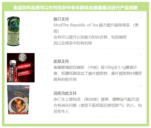 健康是老年消费者最为关注的要点。因此,他们会根据自己的健康状况,积极调整自己的饮食,来配合自己的养生和保健目标。这为老年食品饮料创新带来最大机遇。