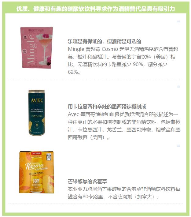 消费者对酒精替代品的高度兴趣为CSD品牌提供了使用机会。为了巩固其作为酒精替代品的地位,CSD 将需要提供更适合的品质(例如低糖、卡路里含量)以及复制与酒精相关的特定口味期望。